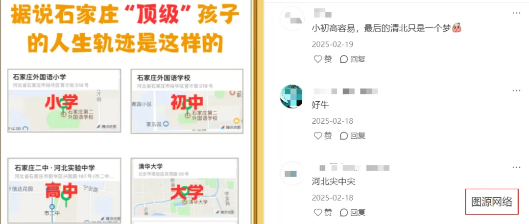 相信石家庄的家长应该都看过这张图或视频吧,叫《石家庄孩子的顶级学习轨迹》:小学石家庄外国语 → 初中石家庄外国语 → 高中石家庄二中 → 大学清北。
