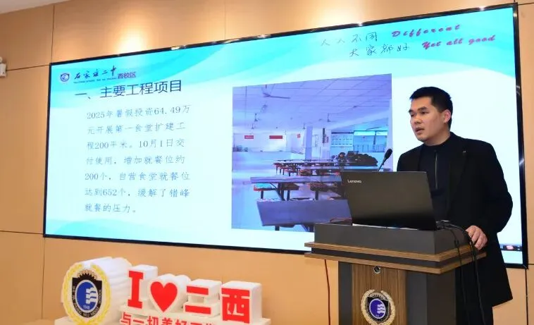 总务科主任邢玉彬:以 “服务育人” 为宗旨,通过餐厅硬件升级、食品安全信息化监管、“互联网 + 明厨亮灶 + AI”等举措让满意度保持在 95% 左右,学校成为全市食堂改革标杆。而食堂的众多暖心活动,如新生酸奶慰问、期中盲盒抽奖、面条自助、无人售卖模式等让二中西校区充满温度,同时彰显了二中西校区的时时处处诚信教育、感恩教育等育人理念。