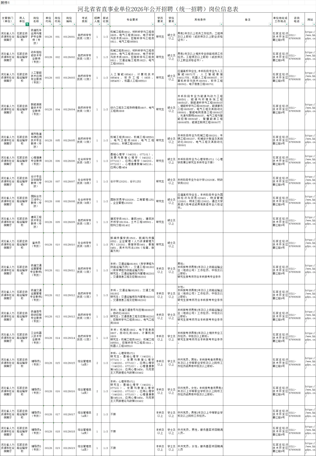 2026年石家庄铁路运输学校拟公开招聘工作人员22名。具体招聘人数和岗位条件详见《河北省省直事业单位2026年公开招聘(统一招聘)工作人员公告》附件1:《河北省省直事业单位2026年公开招聘(统一招聘)岗位信息表》,其中专业参考教育部公布的研究生、本科、高职(高专)专业目录和人力资源和社会保障部公布的技工院校专业目录设置。对于取得海外院校学历学位或毕业于国内院校自设学科的考生,如专业名称与岗位要求专业名称不完全一致,可根据应聘人员在校期间所学课程、研究领域及毕业院校开具的学科专业证明等材料进行综合研判,严格把握,统一标准,作出决定。