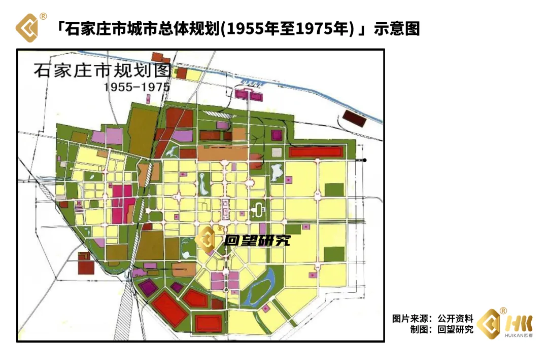 三项风口之下,当时的石家庄已是铁路交通的要冲(「交通中心」);不出五年,就是新中国的纺织和医药基地(「经济中心」、「产业中心」);到了1957年,又将是河北省的省会(「政治中心」)。这样一座集政治、经济和交通中心于一身的城市,它的总体规划注定不能马虎:构建的产业,动辄就是「国家级」,既要给出当下的承接空间,也得留出未来的扩张空间;和产业一起来的,是规模庞大的产业工人,五湖四海、拖家带口、人吃马喂的,要给他们划定居住和生活的空间,既要离产业基地比较近,还要在周边把公建配套配齐;和省会一起搬来的,是各大机关单位,要在产业区和配套居住区之外,划定出独立的「政务区」;既然已经是省会城市了,那就是河北省的「门面」,理应要有省会城市的形象和分量。