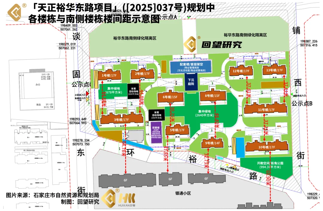 仔细看这个项目的楼间距,普遍在37至44米之间;最小的,是5号楼和6号楼之间,是30米(约30.25米);可6号楼位于小区的中央,换言之,它就是「楼王」之一,面前便是(建筑)面积超过2600平方米(约2640平方米)的中心景观区,以天正的一贯风格,以及前年的「产品升标」,势必要在这里大做文章;即便是采光,东侧的8号楼和9号楼之间,就是将近50米(约48.40米)的楼间距,换言之,6号楼的东南方向便是一马平川,至于西南方向,则是3号楼,以及它面前隔环裕路相望的银通小区,楼间距更是超过了60米(约64.78米),加上银通小区普遍的六层高度,这边也是一马平川。