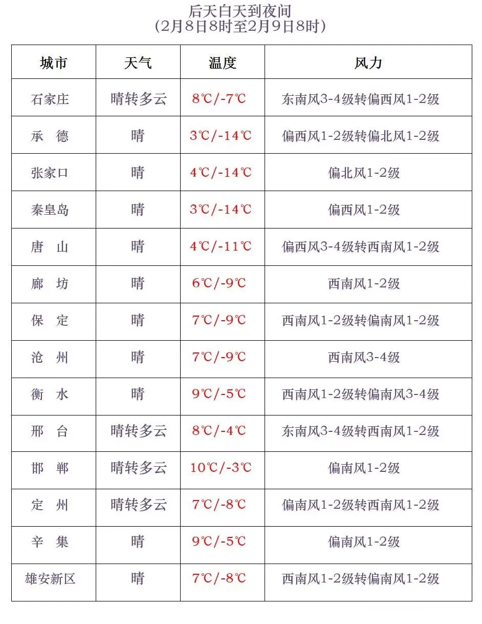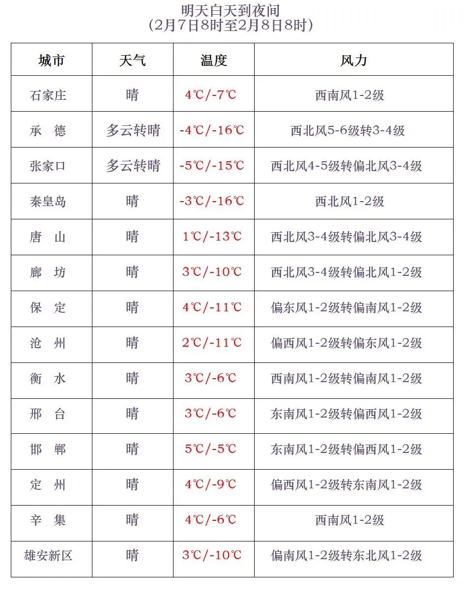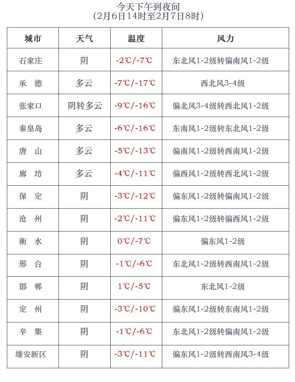 河北省气象台2026年02月06日11时发布天气预报:今天下午到夜间,全省多云间阴,其中沧州南部、衡水、邢台东部、张家口西南部、石家庄和保定、邢台、邯郸三个地区的西部有小雪或零星小雪。最低气温,明天早晨全省大部分地区最低气温继续下降2~4℃,张家口、承德、秦皇岛、保定西北部-23~-14℃,其中坝上地区-32~-24℃,其他地区-13~-5℃。明天白天,保定、廊坊以北地区多云转晴,其他地区晴间多云。张家口、承德、保定西北部有西北风4到6级,阵风7到8级。最高气温,张家口、承德、秦皇岛北部-19~-4℃,其他地区-3~6℃。明天夜间到8日,全省晴间多云。8日夜间到9日,西部山区晴转阴有零星小雪或雨夹雪,其他地区晴转多云。