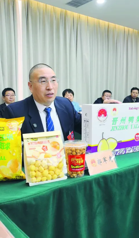 图为市人大代表郭军考向与会代表推介他带来的晋州农产品。