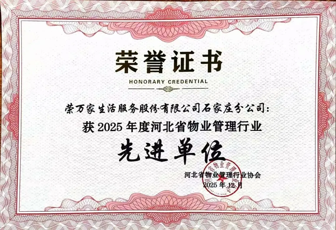 荣万家生活服务股份有限公司石家庄公司荣获“2025年度河北省物业管理行业先进单位”。