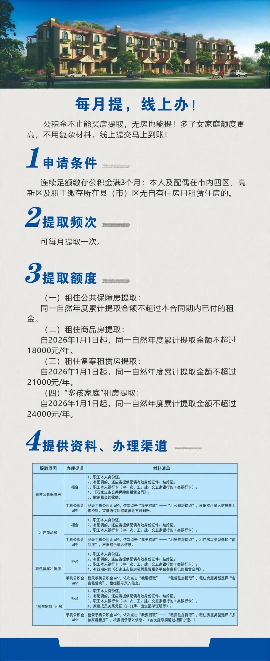 答:符合我市租住商品住房提取条件的职工及其配偶,同一自然年度累计提取金额由15000元/人提高至18000元/人;提供石家庄市住房租赁监管服务平台备案登记的租赁合同的,由18000元/人提高至21000元/人;生育两个及以上子女的,由21000元/人提高至24000元/人。