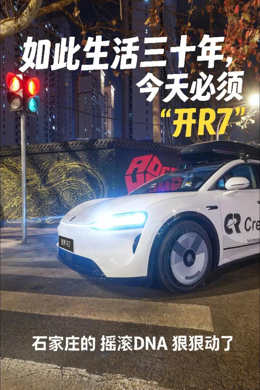 最后一站,车队来到万能青年旅店乐队涂鸦墙,这里已经成为“滚迷”们周末到河北的必打卡点。智界潮改座驾与万青、痛仰等乐队的涂鸦画面相呼应,连红绿灯都变得“摇滚”起来。石家庄的摇滚文化,从来都不是小众的狂欢,而是这座城市年轻活力的缩影。