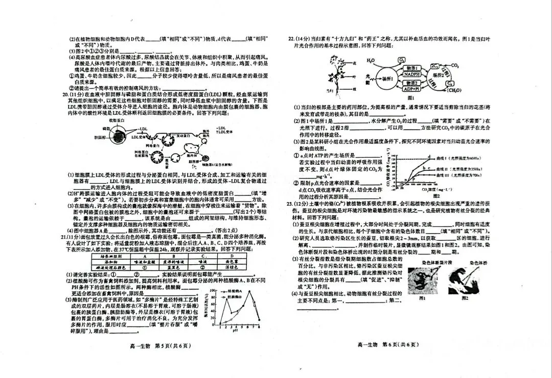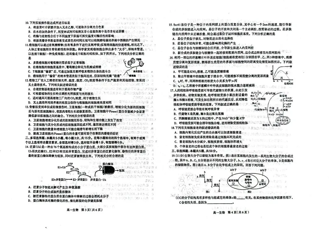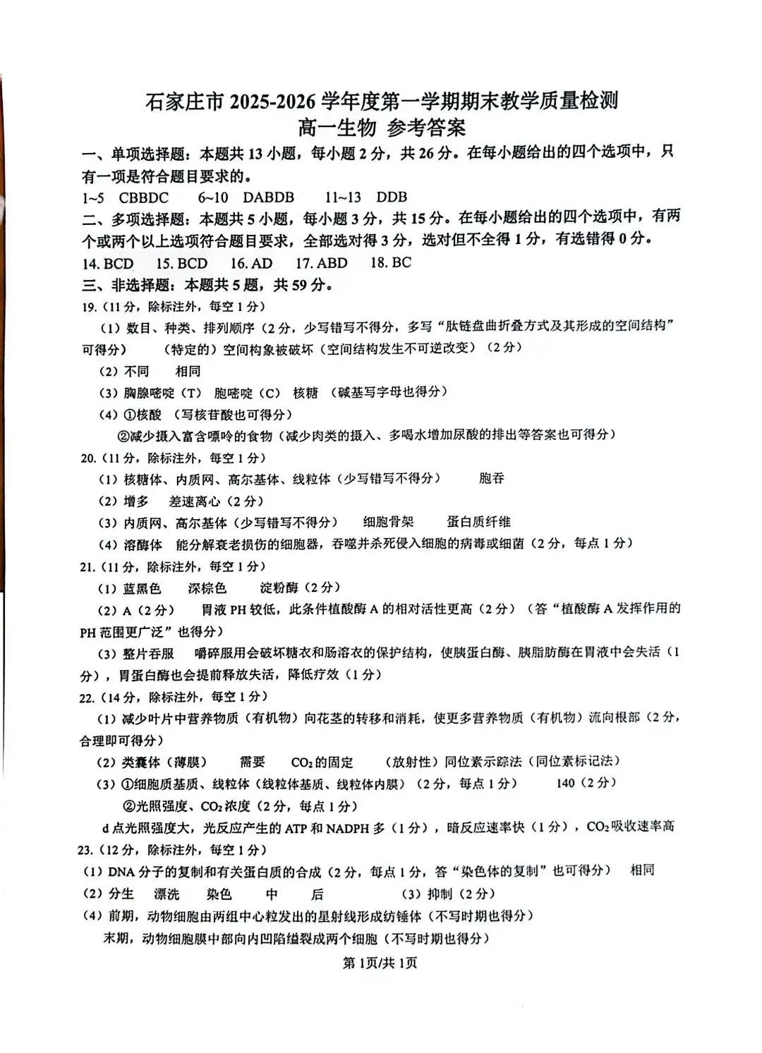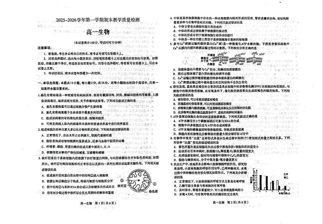 >石家庄市2025-2026学年度高一生物第一学期期末教学质量检测题