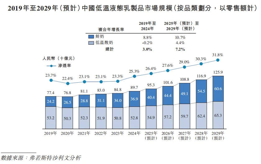 其中,低温奶凭借“新鲜”“健康”“营养保留度高”等属性,成为近年来少数仍保持较快增长的品类。弗若斯特沙利文数据显示,中国低温液奶市场规模从2019年的774亿元稳步增长至2024年的897亿元,复合年增长率为3.0%。并预计到2029年将增至1259亿元,2025~2029年复合年增长率达7.2%。同时,低温液奶在液奶市场中的占比,也将由2024年的25.3%提升至2029年的31.8%。