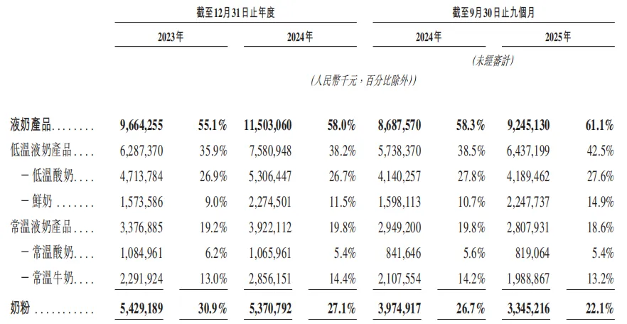 从行业整体看,中国乳业正在经历明显的结构性分化。液态乳制品仍是乳制品市场中规模最大的细分领域,主要由常温液态乳制品和低温液态 乳制品构成,第二大细分领域则是奶粉产品。但不同品类之间的增长节奏已出现显著差异。