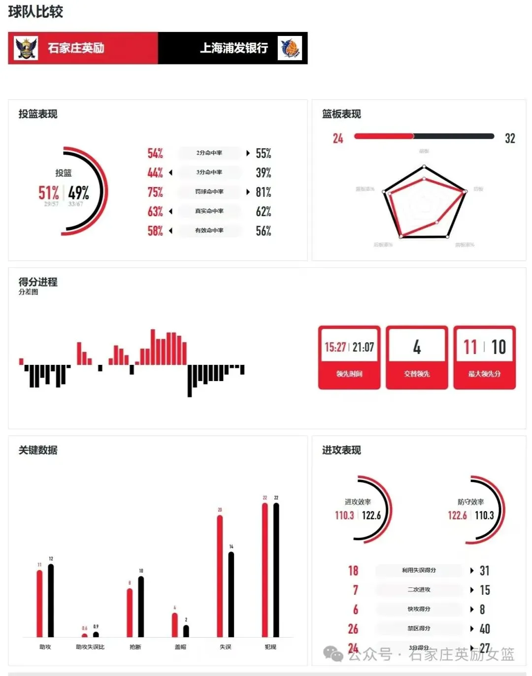 开局强势:石家庄英励在首节和第二节分别以27:25、29:24领先,展现出了强劲的进攻火力,半场结束时手握7分优势。第三节波动:第三节比赛风云突变,石家庄英励仅得到13分,而上海浦发银行单节轰下23分,一举反超比分,将比赛主动权掌握在自己手中。末节追分未果:尽管第四节石家庄英励努力追分,单节得到21分,但上海浦发银行凭借稳定的发挥,单节拿下28分,最终以10分优势锁定胜局。
