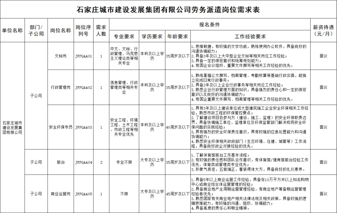 石家庄城市建设发展集团有限公司,成立于2022年4月,为国有全资企业。经营范围主要包括:土地整治服务;房屋拆迁服务;企业管理咨询;工程管理服务;物业管理;会议及展览服务;污水处理及其再生利用;停车场服务;非居住房地产租赁;房地产经纪;房地产咨询;市场营销策划;销售代理。目前主要承担太平河片区和正太广场周边区域建设工作。 根据工作需要,石家庄城市建设发展集团有限公司特委托石家庄市国经人力资源管理有限公司面向社会公开招聘劳务派遣制人员6名。现将具体招聘流程设定如下: 招聘工作坚持德才兼备的用人标准和“公开、平等、竞争、择优”的原则,面向社会实行市场化公开招聘。 采取网上报名、资格初审、资格复审、面试、体检、拟录用等步骤进行。河北省石家庄市。