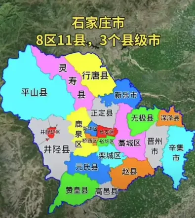 如今的石家庄市是河北省省会, 全市总面积 15848 平方公里 ,下辖8个区、11个县、 3个县级市。 8个市辖区:长安区、桥西区、新华区、裕华区、井陉矿区、藁城区、鹿泉区、栾城区。 11个县 :井陉县、正定县、行唐县、灵寿县、高邑县、深泽县、赞皇县、无极县、平山县、元氏县、赵县。 3个县级市 :晋州市、新乐市、辛集市。 此外,石家庄市还设有多个国家级功能区,包括石家庄高新技术产业开发区、石家庄经济技术开发区、中国(河北)自由贸易试验区正定片区和石家庄综合保税区。 这座城市地处中国华北地区、河北省中南部,跨华北平原和太行山地两大地貌,形成了独特的自然景观和丰富的物产资源。美食与特产