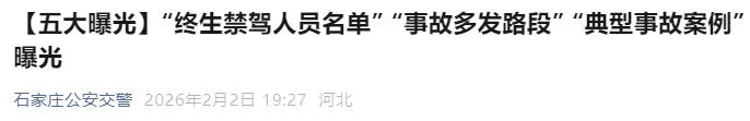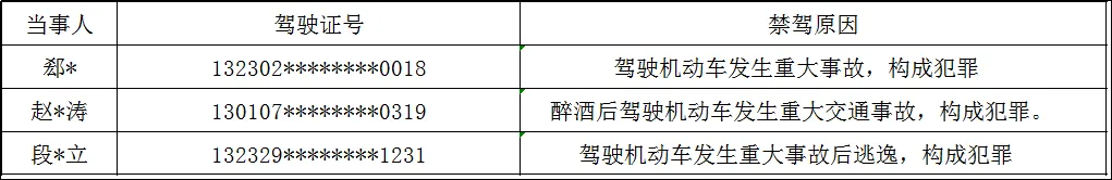 为提升全民交通法治意识、安全意识、文明意识,切实提升交通参与者遵守交通法律法规的自觉性,从源头上消除安全隐患,全力预防和减少道路交通事故,营造安全、畅通、文明、有序的道路交通安全环境,公安交管部门持续开展“五大曝光”行动。现将我市“终生禁驾人员名单、事故多发路段、典型事故案例”予以曝光。