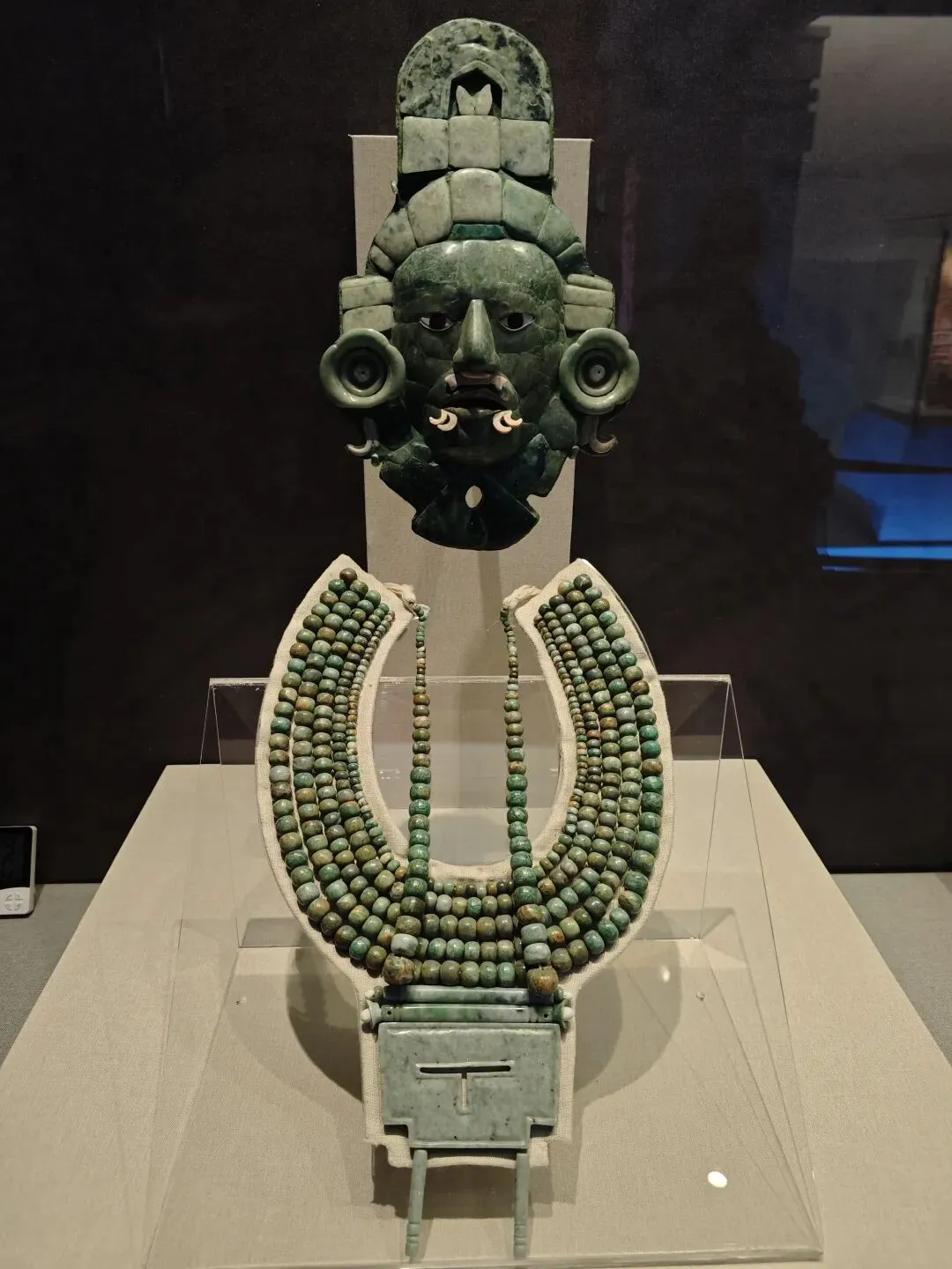 河北博物院《丛林圣殿——墨西哥玛雅文明展》:人形玉面具及胸饰(复制品)