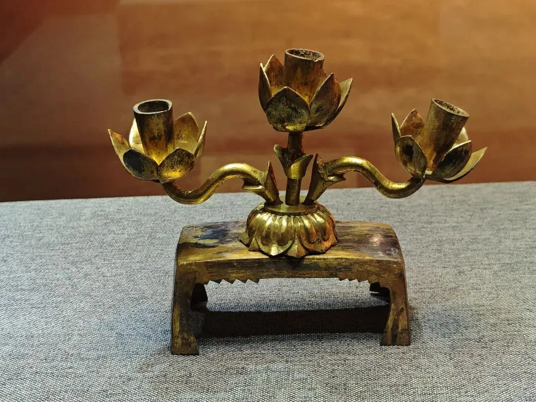 河北博物院《光耀千年——中国古代灯具文化展》:鎏金铜莲花烛台