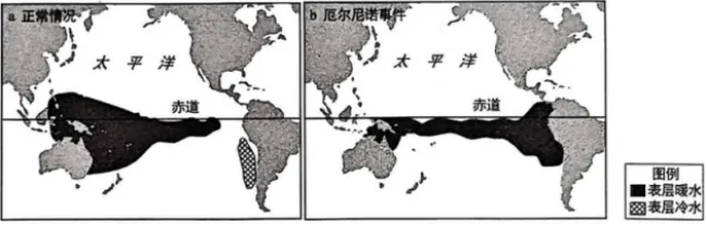 海-气相互作用对于维持全球水热平衡具有重要意义,如果表层海水温度发生异常,大气环流也会异常,甚至出现极端天气事件。如图示意正常情况和厄尔尼诺事件下太平洋表层冷暖水域分布情况。据此完成8~10题。