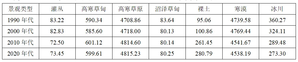 疏勒河发源于祁连山脉西段,是我国河西走廊三大内陆河流之一,上游流域面积1.06×104km2,海拔介于2080~5808m,平均海拔3944m,高寒景观类型多样。随着气候变化加剧,疏勒河上游景观格局发生显著变化。2000~2010年间,由于过度放牧导致高寒草地退化严重,为遏制退化,2005年青海省实施翻耕补播政策,启动人工恢复。如表示意1990~2020年代疏勒河上游不同高寒景观类型面积(km2)。