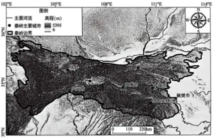 秦岭长1100km,平均宽度300km,地貌类型以中低山和丘陵为主,地形起伏明显,水文资源丰富,植被具有明显空间分区和垂直分带特征。秦岭生态环境质量和人类活动强度存在明显的空间分异特征。生态环境质量的高值区主要分布在中高山区(不包括终年或者季节性积雪区)。人类活动强度的高值区主要分布在中低山区和山前冲洪积平原。秦岭向东延伸就是长约1000km的淮河,秦岭-淮河线是我国东部季风区内北方地区与南方地区的分界线。如图示意大秦岭区位。