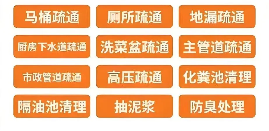疏通类:疏通下水道、马桶、蹲厕、地漏、下水管;通坐便、蹲便、小便池;疏通主管道、疑难管道。