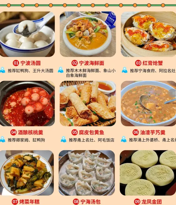 早餐推荐一碗“缸鸭狗汤圆”。糯皮薄得几乎要透光,汤是淡淡甜香,一勺下去,芝麻馅“呲”地流出。中午可以去老三江口附近吃海鲜面,蛤蜊、青口、带鱼全是现打捞上岸的,新鲜得发亮。晚餐嘛,就找家宁波菜馆来碗“咸齑炖黄鱼”,咸香温柔,正好裹一身海味的疲惫。