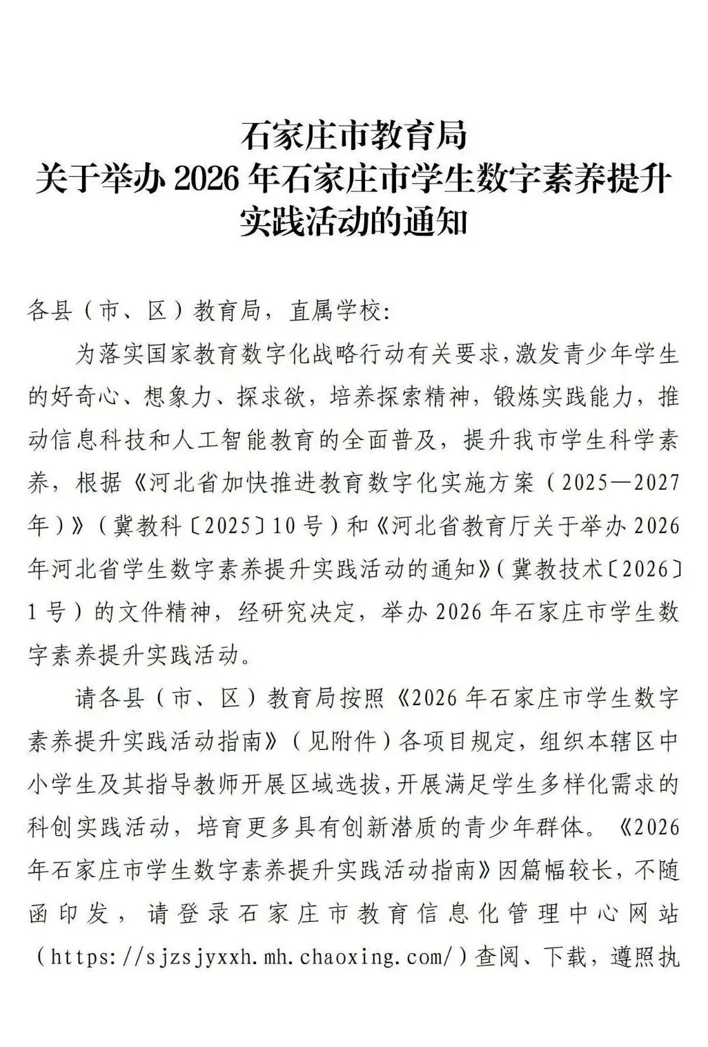 >【石家庄市】关于举办2026年石家庄市学生数字素养提升实践活动的通知