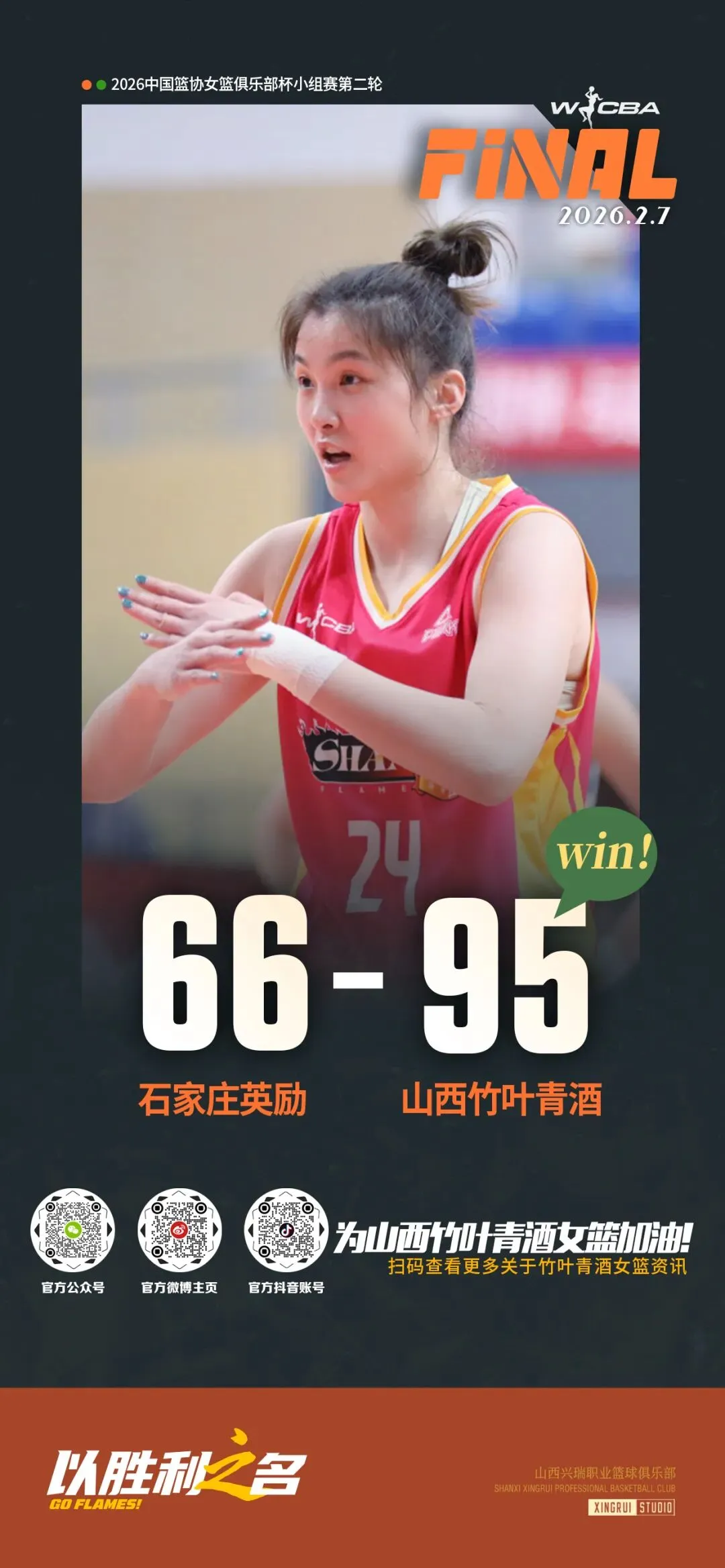 2026年2月7日,中国篮协2026女篮俱乐部杯小组赛第二轮,山西竹叶青酒女篮对战石家庄英励女篮。全场比赛山西竹叶青酒始终掌控比赛节奏,凭借高效的进攻和稳固的防守,以95:66的比分击败对手,再度斩获胜利。