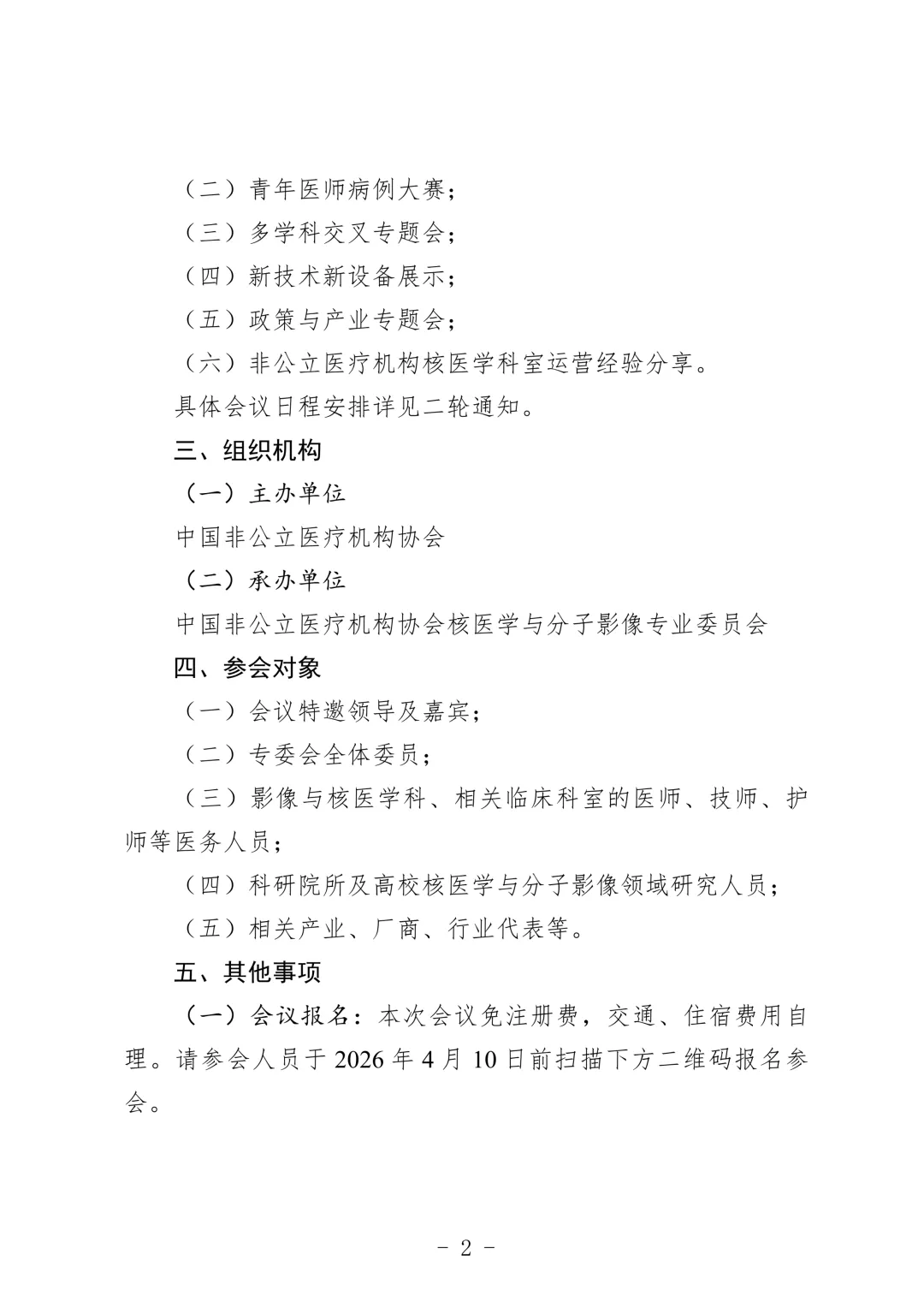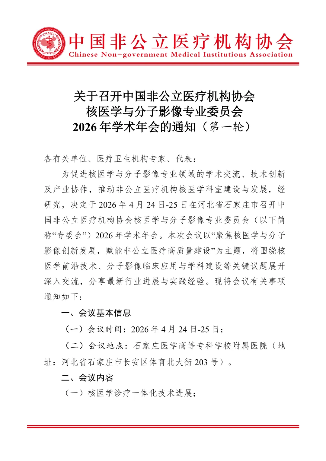 为促进核医学与分子影像专业领域的学术交流、技术创新及产业协作,推动非公立医疗机构核医学科室建设与发展,经研究,决定于2026年4月24日-25日在河北省石家庄市召开中国非公立医疗机构协会核医学与分子影像专业委员会(以下简称“专委会”)2026年学术年会。本次会议以“聚焦核医学与分子影像创新发展,赋能非公立医疗高质量建设”为主题,将围绕核医学前沿技术、分子影像临床应用与学科建设等关键议题展开深入交流,分享最新行业进展与实践经验。现将会议有关事项通知如下: