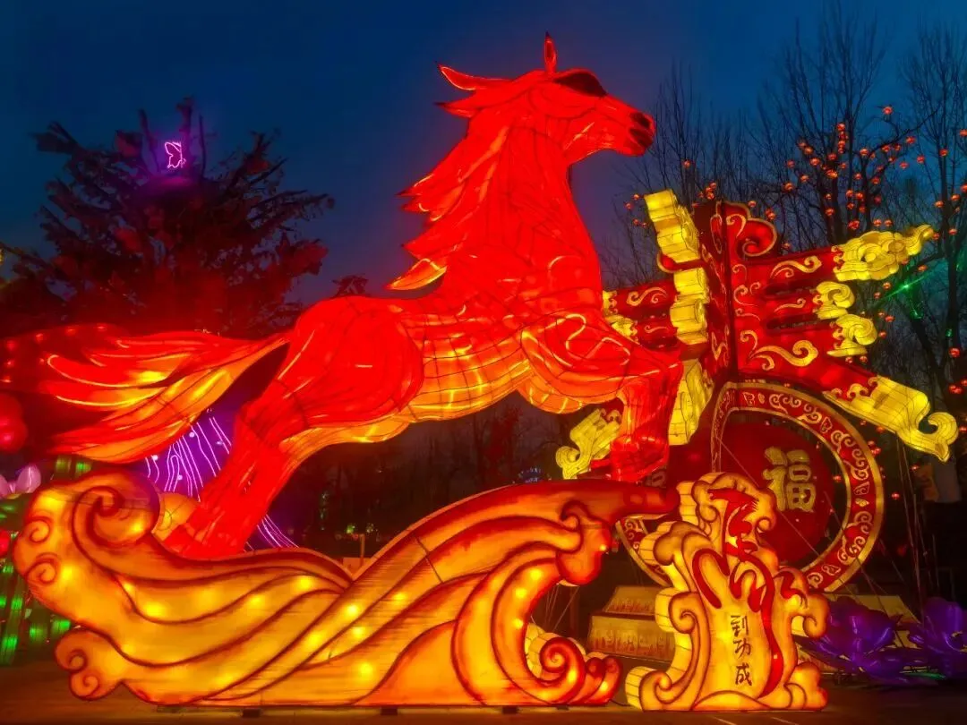 第三届湾里庙灯会特邀四川自贡非遗匠人手工打造,推出“长信宫灯”“天马行云”“哪吒降魔”等十大主题灯组,融合河北本土文化、马年元素与国潮风格,搭配前沿声光电技术,打造沉浸式光影体验;灯会期间还设有文创市集、戏曲专场演出等活动,让游客沉浸式体验“灯在景中,人在灯里”的新春氛围。