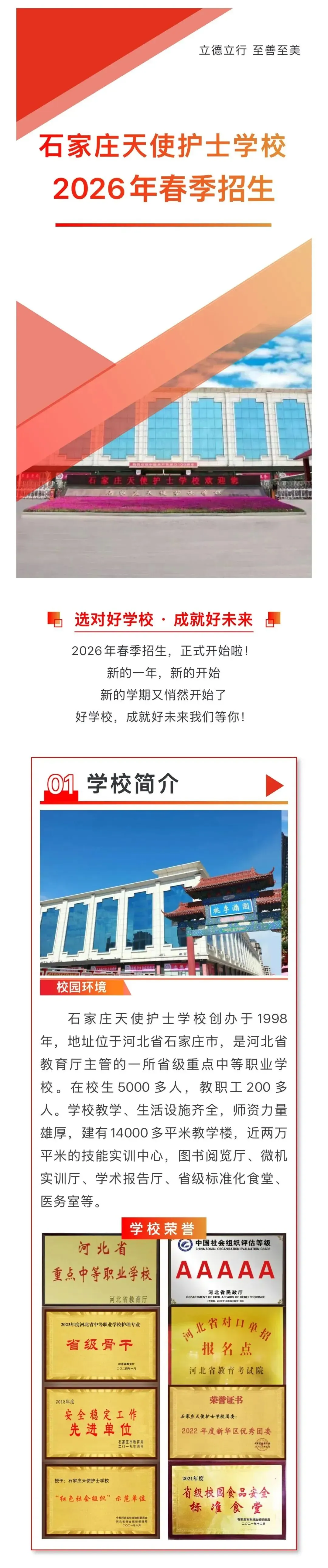 石家庄天使护士学校创办于1998年,地址位于河北省石家庄市,是河北省教育厅主管的一所省级重点中等职业学校。学校经过近30年的成长逐步形成了以护理为骨干专业,口腔修复工艺、中医康复技术、眼视光与配镜、中药等为特色的9个专业,都是当下比较热门的医学类专业。