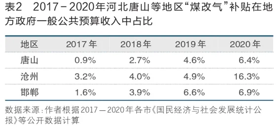 2021年10月,北京理工大学管理与经济学院李慧等人发表《中国“煤改气”面临的挑战及对策建议》74一文,文中提到:2017-2019年“煤改气”等清洁取暖工程共投入1128.2亿元,其中地方补贴合计777.0亿元,是“煤改气”的主要资金。因财政水平、任务紧迫性等差异,各地“煤改气”补贴力度差别较大。从改造后每年的运行补贴来看,太原市补贴力度最大,市、县两级政府给每户的最高补贴达2865元,宝鸡市补贴力度最低,每户每年仅补贴300元。“煤改气”工程增加了地方政府财政压力,2020年沧州(清洁取暖)补贴支出在一般公共预算收入中的占比高达16.3%。由此可见,地方财政的投入决定了适度提高实际提供给用户的清洁取暖运行补贴,而提高程度因地方而异。