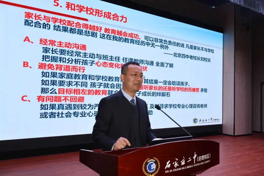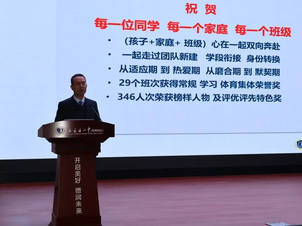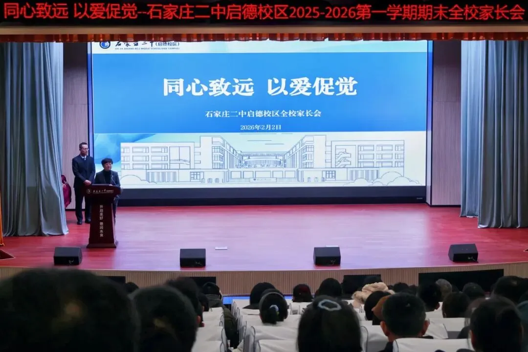 2月2日,石家庄二中启德校区召开2025-2026学年第一学期期末全校家长会。会议由启德校区负责人赵郡主持,石家庄二中校长宋泽亮以“同心致远,以爱促觉”为主题,为一、七年级家长作了专题报告,围绕家校共育、学习动力与成长路径等维度进行了深入分享。