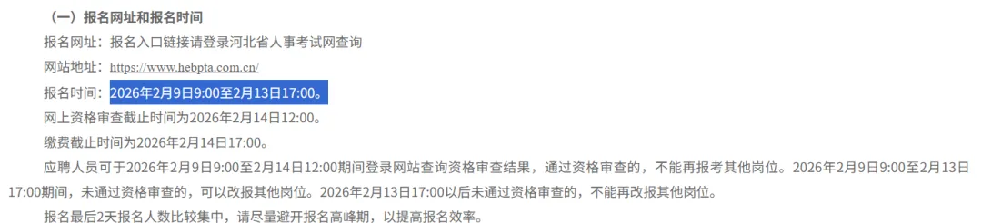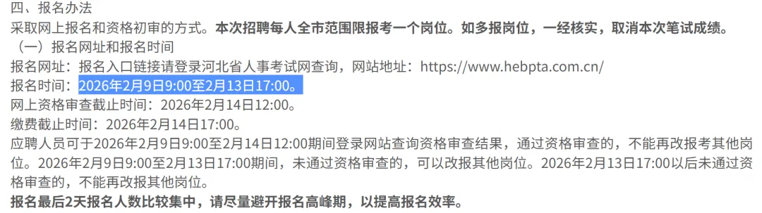 为加强石家庄市事业单位人才队伍建设,根据《事业单位人事管理条例》《河北省事业单位公开招聘工作人员暂行办法》《关于进一步做好全省事业单位公开招聘工作的通知》,现面向社会公开招聘事业单位工作人员。有关事项公告如下:事业单位公开招聘坚持德才兼备和民主、公开、竞争、择优的原则,在考试、考察的基础上择优聘用。本次共招聘事业单位工作人员4786名,各招聘单位的招聘岗位数量、考试类别、资格条件详见《石家庄市2026年事业单位公开招聘(统一招聘)岗位信息表》(附件1),咨询电话详见《石家庄市2026年事业单位公开招聘(统一招聘)咨询电话表》(附件2)。本次事业单位公开招聘有关信息通过石家庄市人力资源和社会保障局官网(http://rsj.sjz.gov.cn)和微信公众号“石家庄人社”发布,请通过指定渠道获取招聘相关信息。2.年龄18至38周岁(1987年2月10日至2008年2月9日期间出生)。对于2026年应届硕士、博士研究生,年龄放宽到43周岁以下(1982年2月10日以后出生);4.具有与招聘岗位要求相适应的年龄、学历学位、专业和技能条件;1.岗位条件中“高校毕业生(含择业期内)”包括以下人员:(1)纳入国家统招计划、被普通高等院校录取的2026年应届高校毕业生;(2)国家统一招生的2024年、2025年普通高校毕业生离校时和在择业期内未落实工作单位,其户口、档案、组织关系仍保留在原毕业学校,或保留在各级毕业生就业主管部门(毕业生就业指导服务中心)、各级人才交流服务机构和各级公共就业服务机构的毕业生;(3)参加“服务基层项目”前无工作经历,服务期满且考核合格后2年内未落实工作单位的人员;(4)普通高等院校在校生或毕业当年入伍,退役后(含复学毕业)2年内未落实工作单位的退役士兵;(5)2026年取得国(境)外学位并完成教育部门学历认证的留学回国人员,以及2024年、2025年取得国(境)外学位并完成教育部门学历认证且未落实工作单位的留学回国人员。2.职业院校毕业生报考时,在符合专业等其他条件的前提下,技工院校预备技师(技师)班毕业生可报名应聘学历要求为大学本科的岗位,高级工班毕业生可报名应聘学历要求为大学专科的岗位。3.按照《国家卫生健康委员会办公厅、公安部办公厅、人力资源和社会保障部办公厅、国家中医药管理局办公室关于贯彻落实住院医师规范化培训“两个同等对待”政策的通知》(国卫办科教发〔2021〕18号)要求,面向社会招收的普通高校应届毕业生培训对象培训合格当年在医疗卫生机构就业的,在招聘、派遣、落户等方面,按当年应届毕业生同等对待;经住培合格的本科学历临床医师,在人员招聘、职称晋升、岗位聘用、薪酬待遇等方面,与临床医学、口腔医学、中医专业学位硕士研究生同等对待。4.岗位条件中“服务基层项目期满人员”是指:参加农村教师特岗计划、“三支一扶”计划、志愿服务西部计划等项目服务期满(含当年)且考核合格人员。服务基层项目人员已被定向录取(聘用)的,不得再享受定向聘用优惠政策,不得报考“服务基层项目期满人员”岗位。5.岗位条件中“服务冬奥大学生志愿者”是指服务冬奥会、冬残奥会的大学生志愿者。6.岗位条件中“退役军人”是指依法退出现役的军官、军士和义务兵。7.岗位条件中“退役大学生士兵”是指以下两类人员:一是服役期满退出现役,入伍前取得普通高等教育大学专科以上学历的退役士兵;二是大学期间应征入伍、服役期满退出现役后复学,取得普通高等教育大学专科以上学历的退役士兵。8.岗位条件中“驻石部队随军家属”是指按审批权限经部队政治工作部门批准随军的现役军人配偶(含军改期间现役干部转改文职人员转改前已随军的家属),且军人所在部队驻地在石家庄市行政区域。9.凡涉及年龄、工作年限等需要确定时间的,计算日期截止到2026年2月9日。招聘岗位所要求的工作经历时间的计算方法是:从2026年2月(含)算起,此前累计工作时间每达到12个月计为1年。在校期间的社会实践(实习)经历,不作为工作经历计算。10.应聘人员不得报考聘用后即构成回避关系的招聘岗位。回避关系包括《事业单位人事管理回避规定》第六条和《河北省事业单位公开招聘工作人员暂行办法》第四十一条所列情形。11.现役军人、试用期内的公务员和试用期内的事业单位工作人员、未满最低服务年限或未满约定最低服务期限的人员、在读的全日制非应届毕业生,不在招聘范围。12.因犯罪受过刑事处罚的人员、被开除中国共产党党籍的人员、被开除公职的人员、被依法列为失信联合惩戒对象的人员,以及法律法规规定不得招聘为事业单位工作人员的其他情形人员,不得报考。本次报名采取网上报名的方式,报名网址:石家庄市人事考试服务平台(https://shijiazhuang.cptae.com/tip)。网上报名时间:2月9日9:00至2月13日17:00资格审查时间:2月9日9:00至2月14日12:00每名考生限报考一个岗位。为避免报名后期网络拥堵,请考生尽早报名,避开报名高峰期,以免影响个人报名。考生提交报名信息后,由招聘单位及其主管部门进行网上资格审查。网上报名和资格审查的流程如下:1.报名准备。请考生在开始报名前,详细了解本次招聘的程序步骤、有关政策和招聘岗位条件。建议使用电脑登录报名系统,不要使用手机登录。2.注册账号。首次登录报名系统,请按照系统提示注册用户名、设置