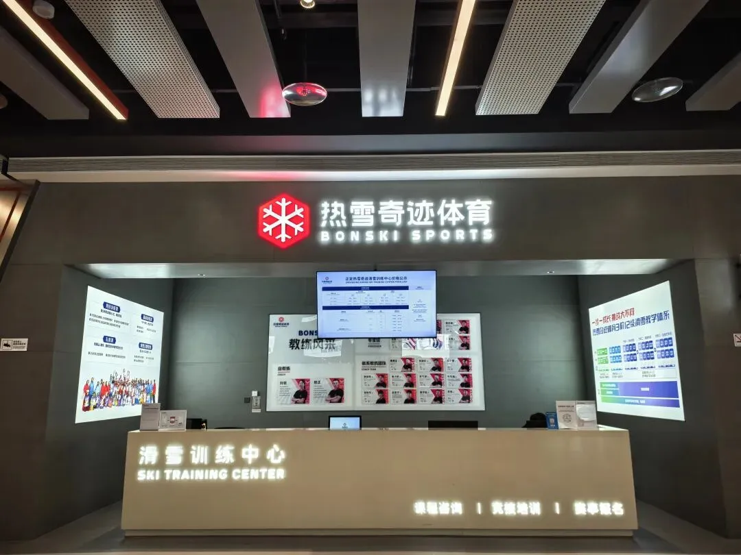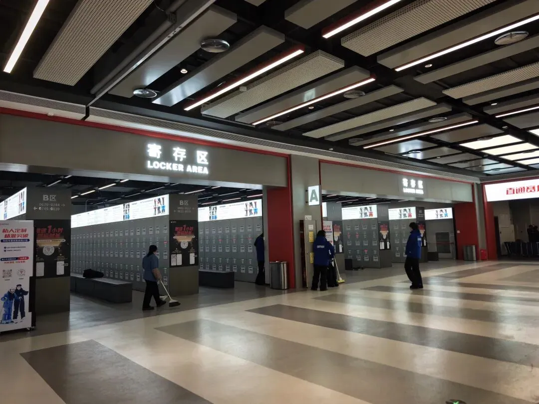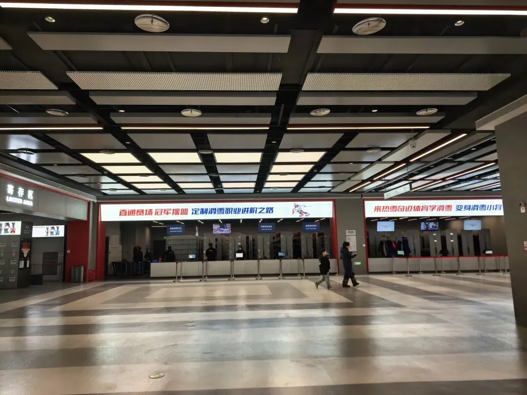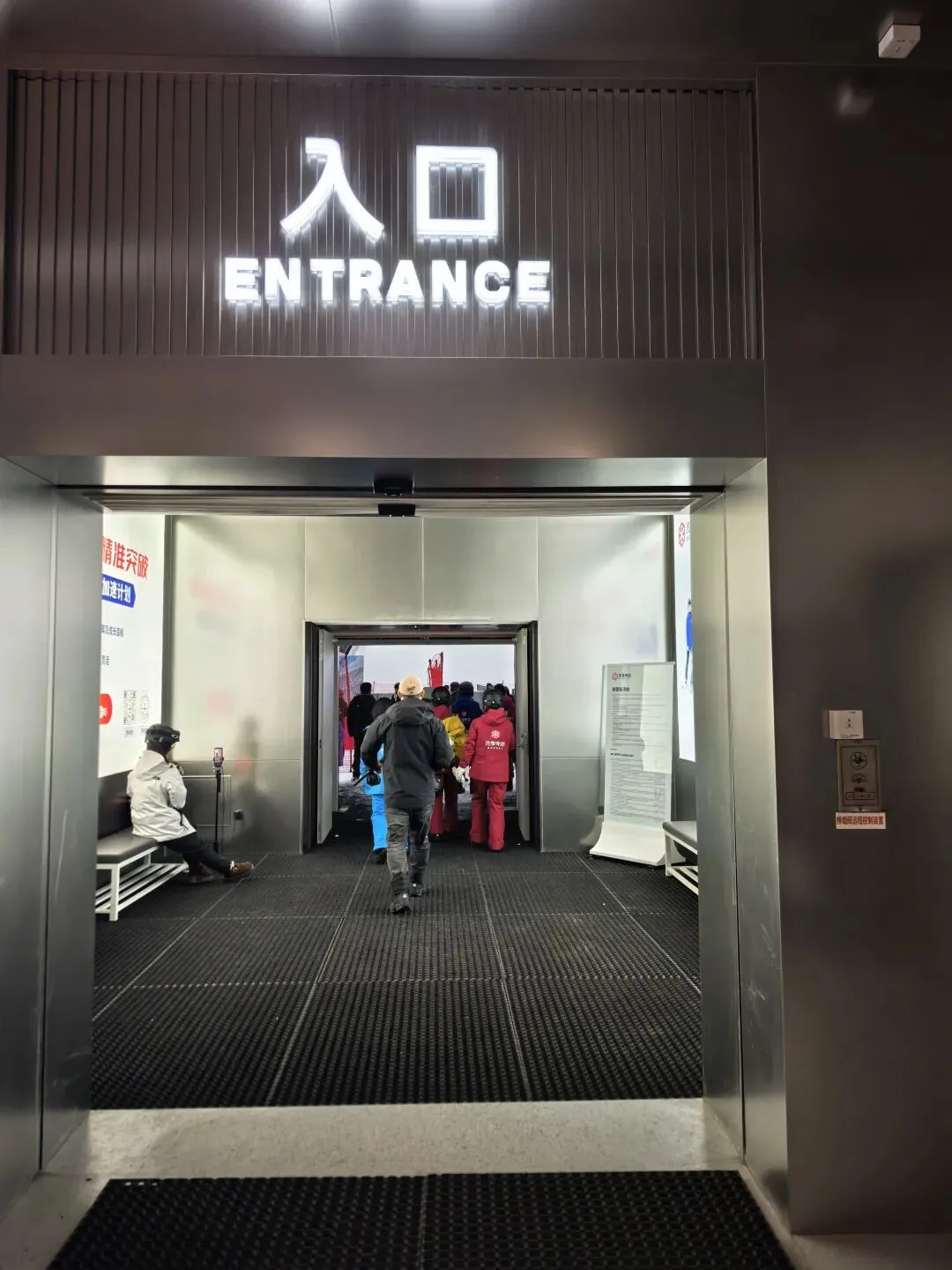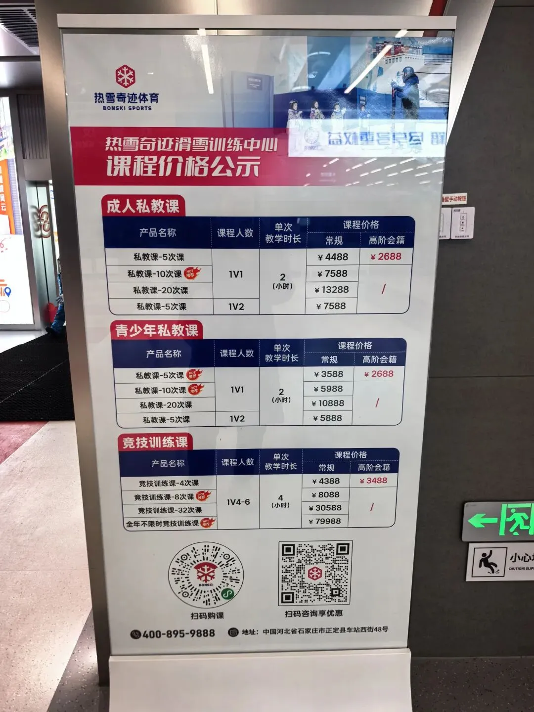 滑雪场的北边是停车场,看看滑雪场上方这个高大的建筑,一定是滑雪坡道了。停车场的面积不小,但所停车辆也就占了1/10的面积。向南走,进正门,边走边欣赏这个规模体量巨大的建筑。集合后,工作人员进行简单讲解和活动任务安排,刷卡进门。进来以后是个面积很大的厅,所有进场前的服务项目一站式配齐。换下来的衣物存在柜子里,手机扫码开柜,柜子要掏租金,租金20元,押金20元。滑雪服和靴子拿到手时是干燥而温热的,都提前烘干过,穿着很舒服。这个窗口可以约私教,日常教学价格一人一小时350元。进滑雪场的入口还有一个价目表,以1v1的私教课为例,每次两小时,5次是4488元,单次相当于897.6元,都说冰雪运动烧钱,看这课程价格就知道了。换好滑雪服和靴子,再刷卡领头盔,就可以进滑雪场了。脚下的雪非常松软,走起来一脚深一脚浅的,这里的雪造得更接近大自然的雪。