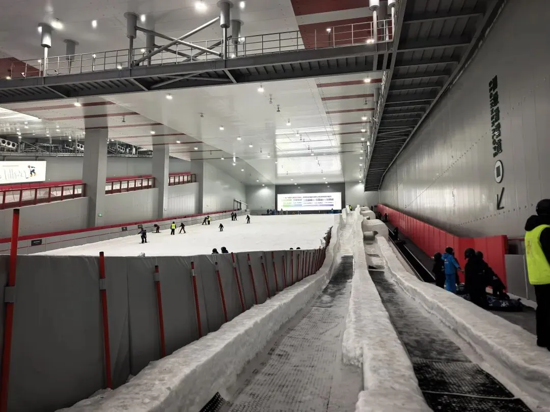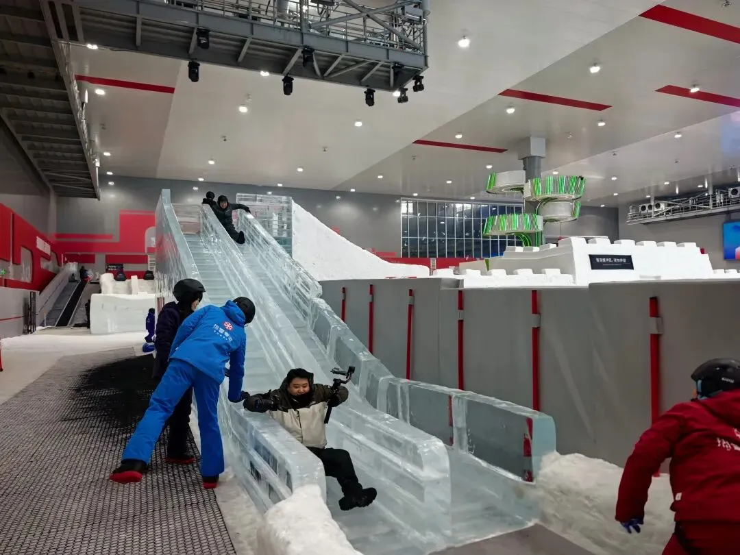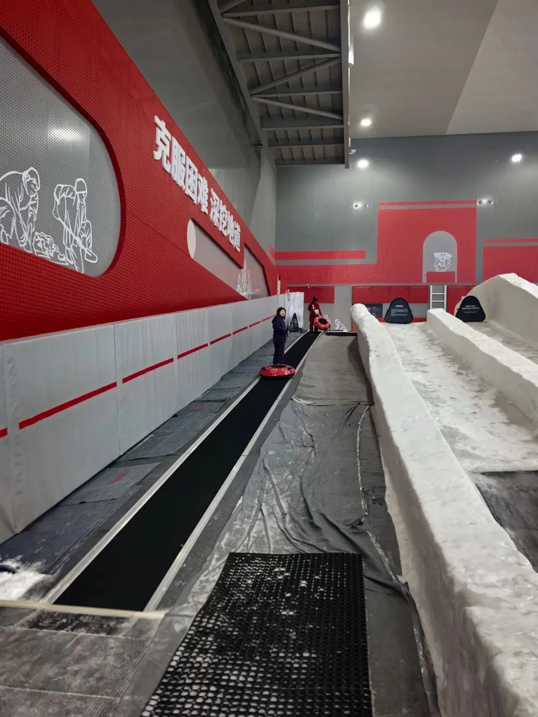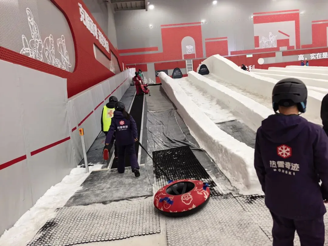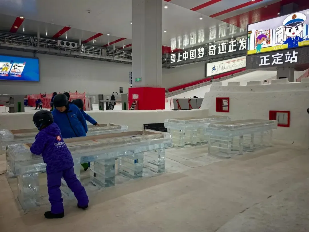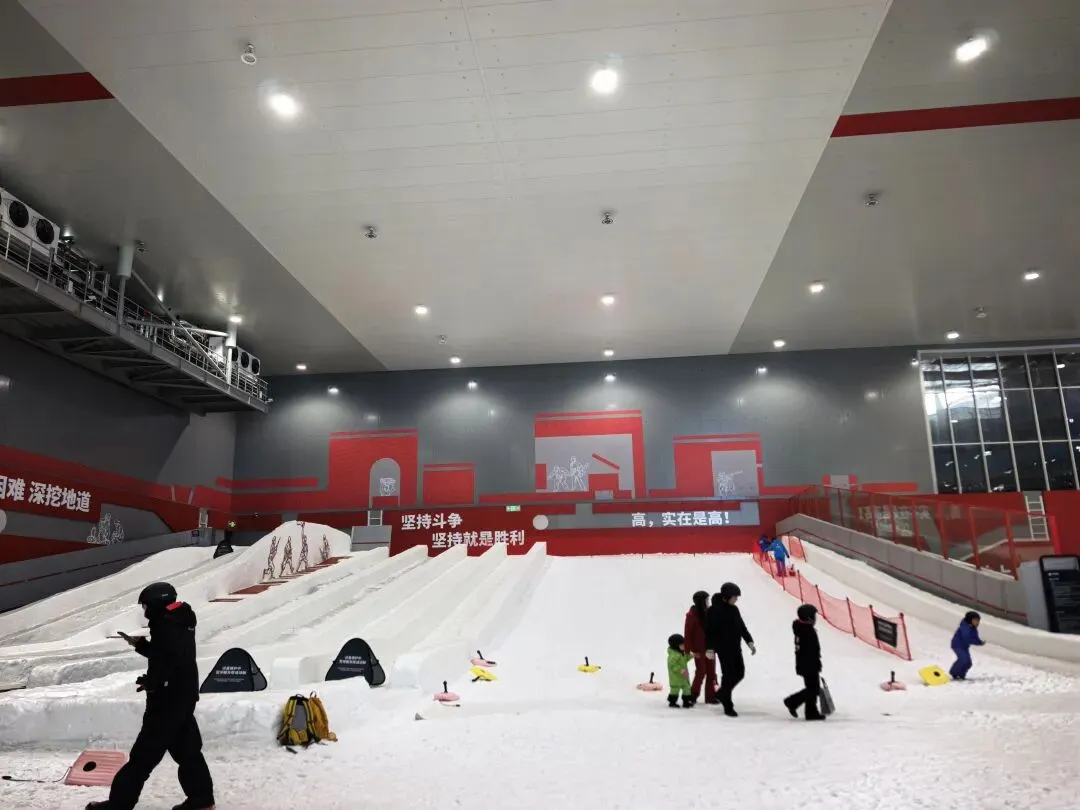 整个室内滑雪场分滑雪区和儿童游戏区。总建面超3万㎡,全年恒温-6℃;拥有130米初级道(8°)、255米中级道(13°),总长385米,最大落差46米;配套地形公园,雪质优良;另有约3600㎡冰雪乐园,含雪圈、雪上保龄球、地道寻宝等十余项亲子项目。应该是在里边能进行巷道战,但我们没有玩,不知道用什么枪械来打仗。是让小朋友玩雪滑梯的地方,我好多年不玩了,体验了一把。自己一个人拖着雪爬犁被传送带送到坡顶再滑下来,找回童年的快乐,好好玩!接下来玩雪圈,我拉着雪圈上了传送带,到了指定滑道,服务人员直接让小朋友坐好就推了下去,对我就反复叮嘱:注意双腿弯曲不要伸直,有可能会转方向,不要惊慌,注意不要碰雪道两边,防止受伤…… 看来我在一众小朋友里面显得太突兀了。对面初级道的最右侧,还有两个雪道可以玩雪圈,这两个雪道更长更陡,速度更快,玩起来更刺激。滑梯顶上有个拍视频的工作人员,正在抓拍小朋友们各种呲牙咧嘴的面部表情。虽远远比不上哈尔滨冰雪大世界的大滑梯,那么不妨在这个经晶莹澄澈的冰雪城墙上多体验几次。不知道怎么办玩,就几个圆形金属块,滑一滑,碰一碰,中了红心就走。最后说回雪道,这里有中级道和初级道两种坡道,官方介绍最长的有255米,手机拍摄有些失真,当真正站在这个雪道面前,或者站在雪道顶端,面对这个陡峭曲折的坡道一定会有所敬畏而胆怯。想一想上一次滑雪还是在多年前,大学刚毕业,零基础的我,靠着小时候打冰溜的技能,踏着滑雪板杵着两根滑雪杆调整方向,从户外滑雪场的大坡道直接滑下,反反复复,乐此不疲,成功率很高,偶尔摔一次也不妨事,不禁感慨年轻真好。不时有踏着单板直接冲下,飞过一道道坡面障碍的,也有滑不过障碍跌倒的,在我眼中这些都是专业玩法了。当天的活动含一项滑雪基础教学,我和同事们主要任务是围观,一切交给教练。待在这里不活动的话一会儿就冷得站不住了,身上冷脚也冷,滑雪服只是一件防水面料的薄棉袄而已,御寒能力远不如羽绒服,雪场内实时温度是零下6度,同事们都没想到温度如此之低,换衣服时都轻装上阵,内里只是件薄毛衫。等小朋友们在教练的带领下上了雪道,赶紧出来在点餐区补充热量,烤肠鸡米花墨鱼丸热饮,大家一起补充了个遍。夜幕降临,部分同事和小朋友仍旧玩性正浓,我说我要回家。出门向停车场走去,想想这次只玩了整个雪场一半的面积,就觉得热量消耗巨大,如果南边那一半区域开放的话,这体量和规模,不愧是整个华北地区排第一名的。斜对面是正定酒厂,大红的标语,独特的外观,颇有上个世纪热血沸腾年代的感觉。晚上回到家,队友说你怎么脸这么红,好像还大了一圈,我摸了摸,挺烫,照镜子一看,的确满脸潮红,可能是滑雪场的温度过低导致的,除了头盔和眼镜的保护区域之外,都红了,两天之后我右脸颊还有一块红印,寒冷的杀伤力真大。队友开始感慨:玩冰雪运动不容易、东北人民的生活、抗联、单衣赴朝的志愿军战士……由于本次活动是单位福利,到底消费了多少我也不知道也不好问,雪场内有购票二维码,这是扫码可见的价格,但是否包含滑雪服棉靴和头盔不得而知。感觉当天的游客占比并不大,大多是家长带着小朋友来参加研学活动的,整体来看,正定热雪奇迹是既适合亲子体验也适合专业人士游玩的室内冰雪乐园。从场地与设施来说,雪质稳定、雪道分级清晰,配套装备齐全、取用方便,省去不少准备麻烦。从安全与服务上看,现场指引清晰、防护到位,对小朋友十分友好。目前正在打造室内雪上研学基地,将冰雪运动与红色教育、正定历史文化结合,打造“冰雪+研学+古城”模式 。总之,这里硬件条件优越,服务细节到位,兼顾专业性、安全性与趣味性,如果消费水准跟得上的话,推荐打卡。