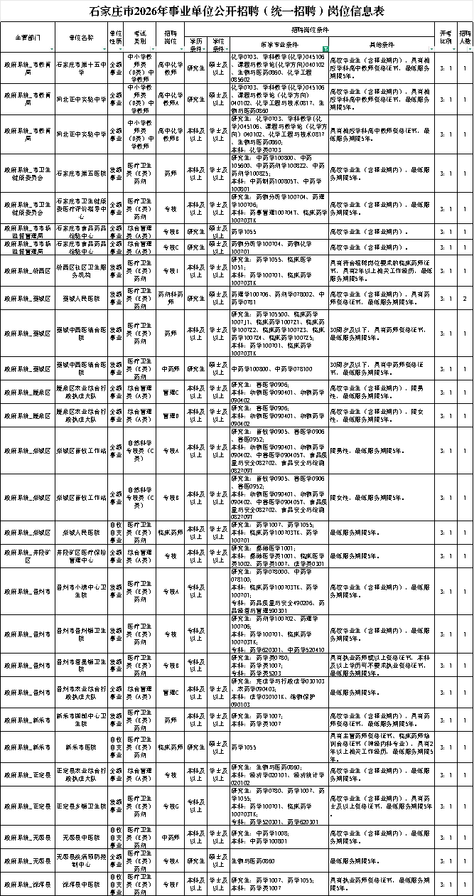 1.石家庄市2026年事业单位公开招聘(统一招聘)岗位信息表