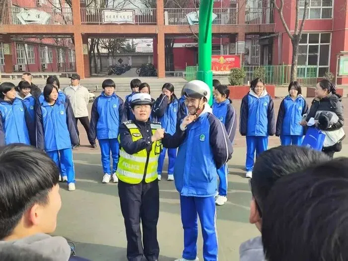 随后,在现场演示环节,民警手把手教同学们如何正确佩戴头盔,并强调头盔在意外发生时对头部的重要保护作用。互动式教学让同学们快速掌握了实用的安全技能。