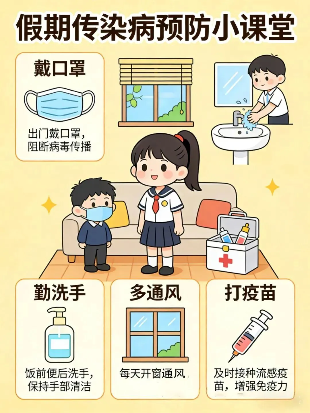 注重个人与公共卫生防护,养成勤洗手、常通风、戴口罩的良好卫生习惯,远离传染病风险;引导孩子保持规律作息,拒绝熬夜沉迷电子产品,合理搭配膳食、均衡营养,杜绝暴饮暴食;鼓励孩子坚持每日体育锻炼,增强体质、抵御疾病,为新学期的学业续航储备充足的健康能量。