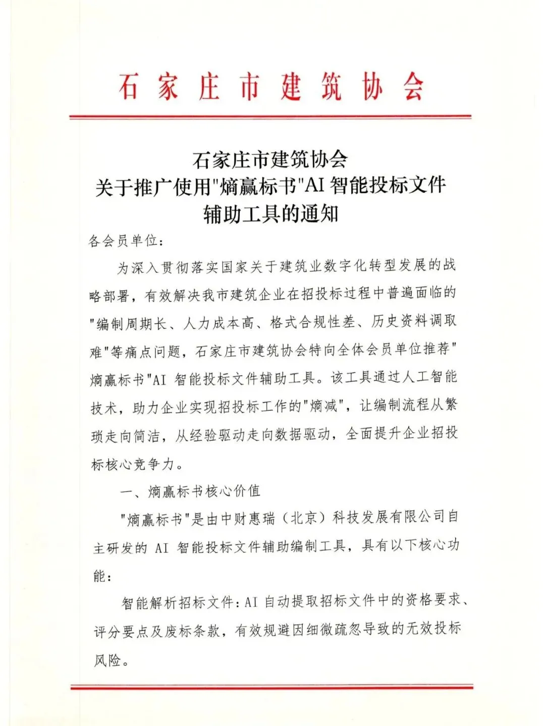 >石家庄市建筑协会关于推广使用"熵赢标书"AI智能投标文件辅助工具的通知