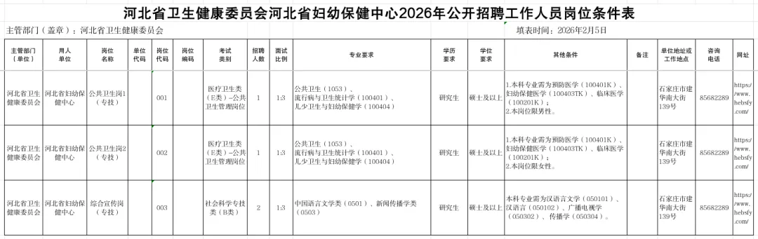 2026年河北省卫生健康委员会直属事业单位河北省妇幼保健中心拟公开招聘工作人员4名,其中专业技术岗位人员4名。具体招聘人数和岗位条件详见《河北省省直事业单位2026年公开招聘(统一招聘)工作人员公告》附件1:《河北省省直事业单位2026年公开招聘(统一招聘)岗位信息表》,其中专业参考教育部公布的研究生、本科、高职(高专)专业目录和人力资源和社会保障部公布的技工院校专业目录设置。对于取得海外院校学历学位或毕业于国内院校自设学科的考生,如专业名称与岗位要求专业名称不完全一致,可由河北省妇幼保健中心根据应聘人员在校期间所学课程、研究领域及毕业院校开具的学科专业证明等材料进行综合研判,严格把握,统一标准,作出决定。