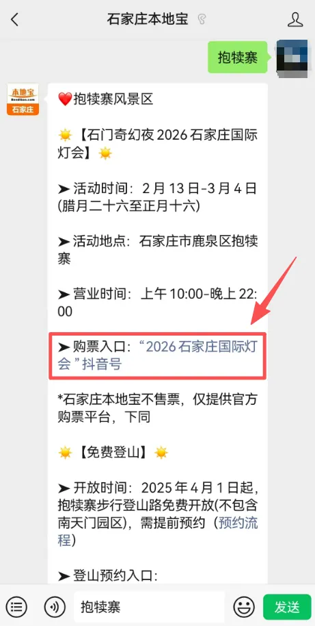 ✅也可关注【石家庄本地宝】公众号,私信回复【抱犊寨】,即可获取“2026石家庄国际灯会”抖音号入口
