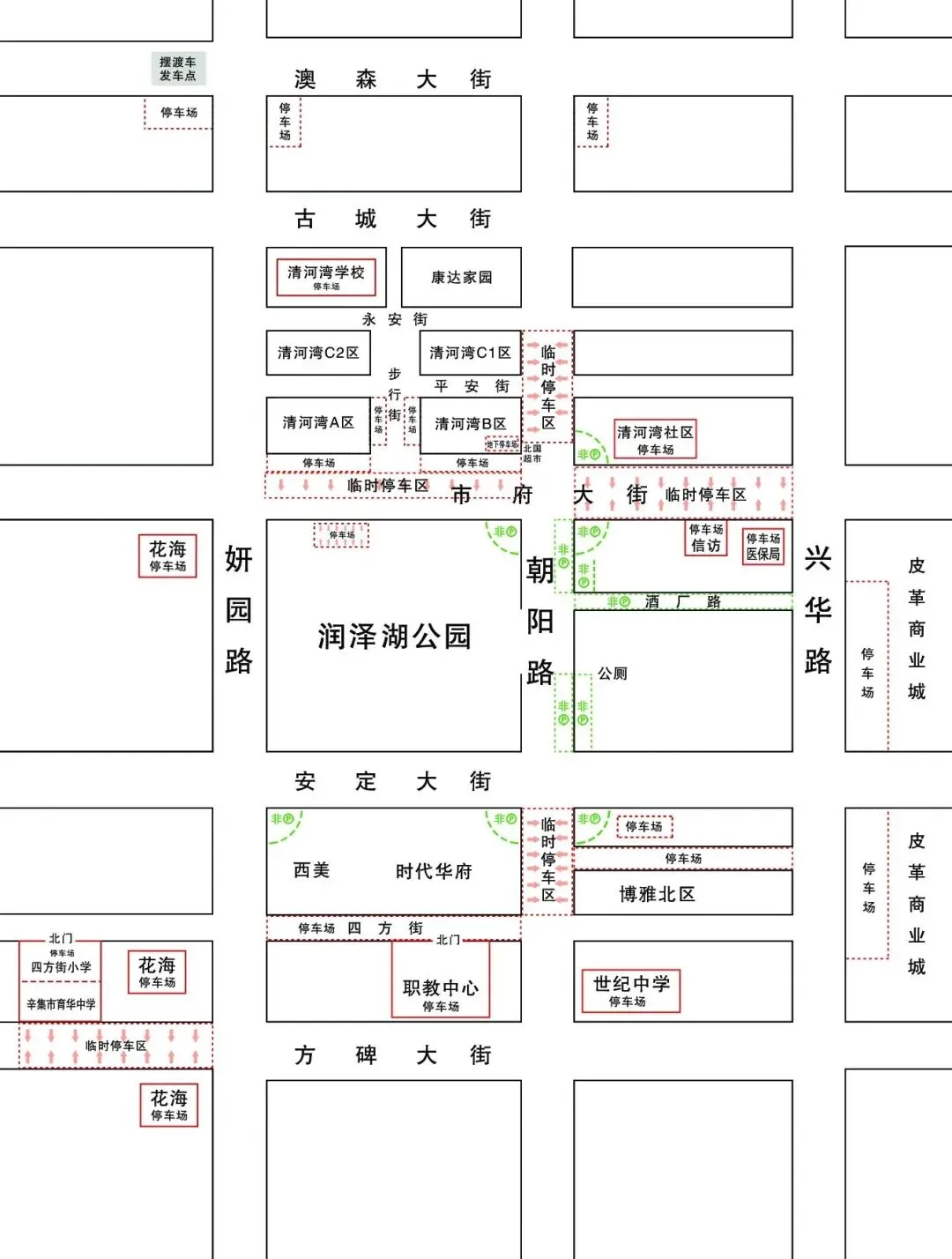 7、安定街与朝阳路交叉口东南侧、博雅北区北侧小街(概算停车位30个)。