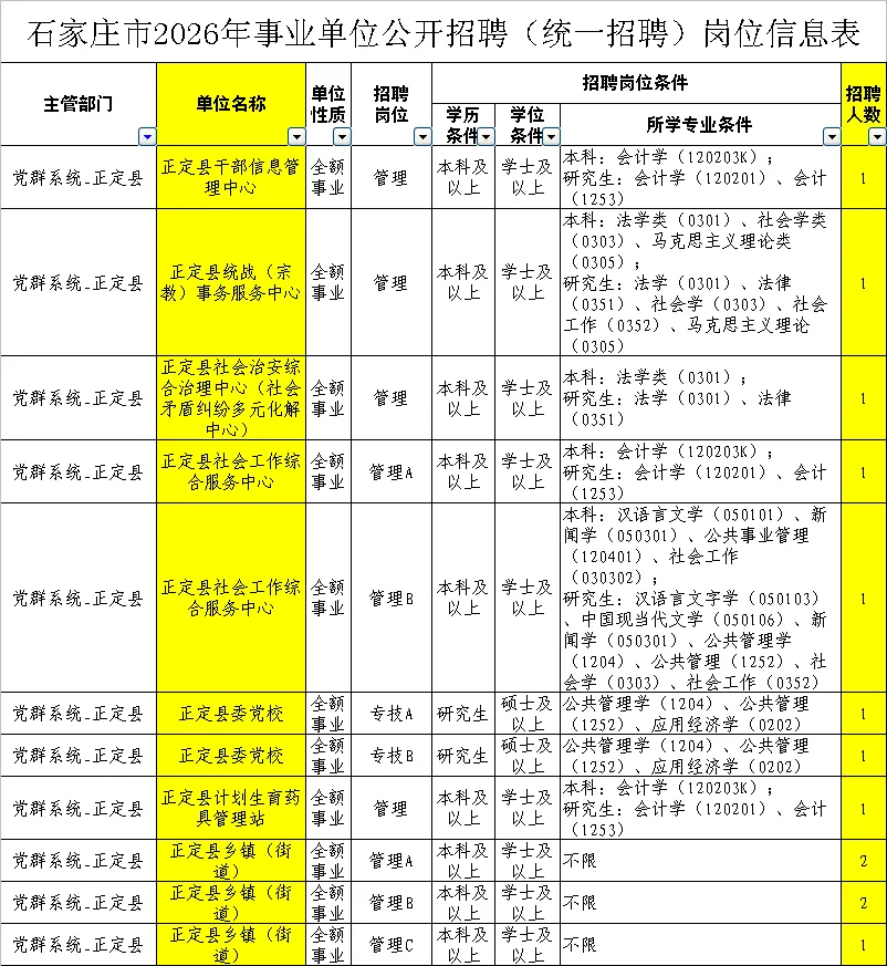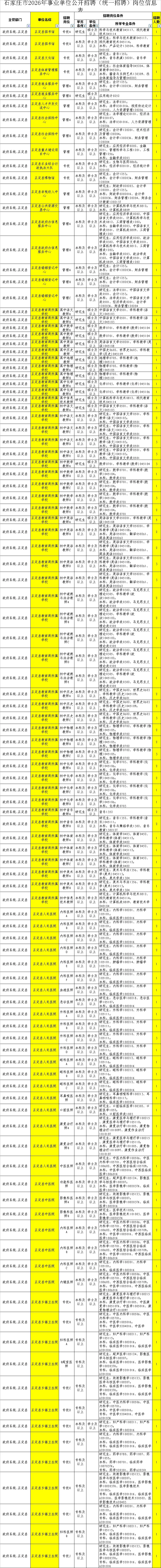 从此次发布《石家庄市2026年事业单位公开招聘(统一招聘)岗位信息表》中,小编为大家整理出了石家庄市正定事业单位招聘职位表!具体如下:
