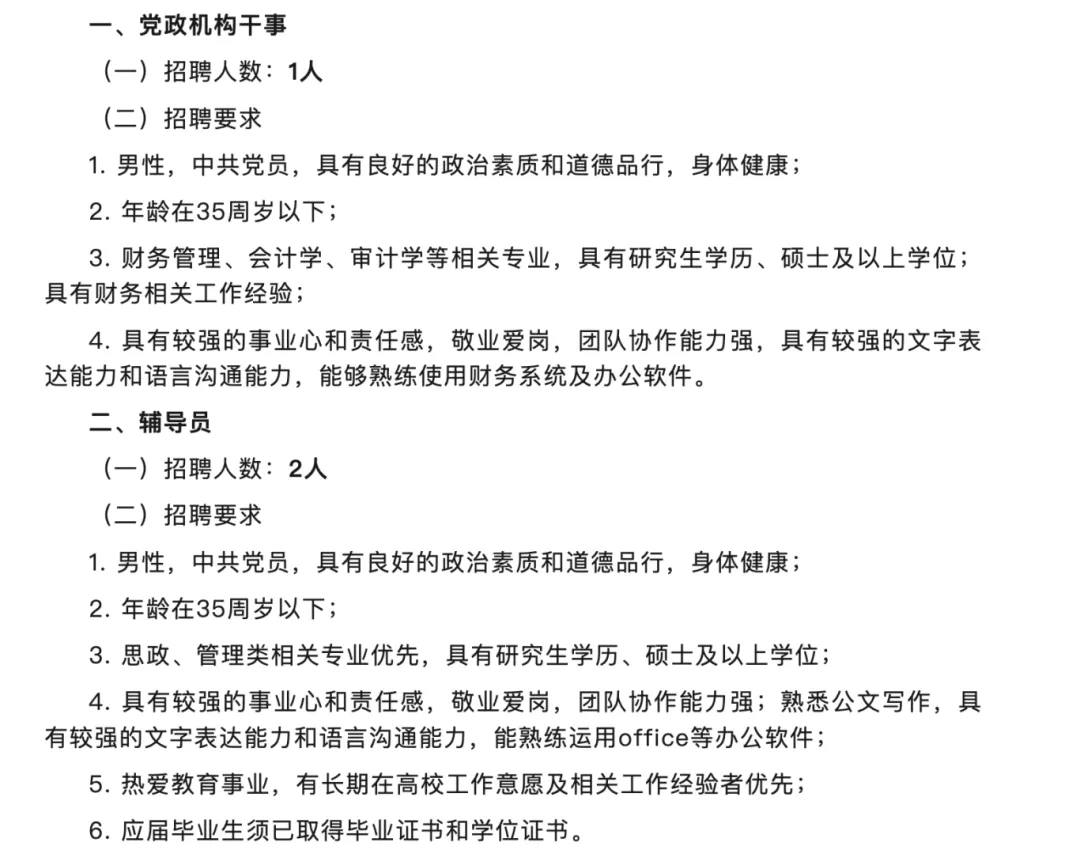 招聘要点:硕士研究生及以上可报,限男性