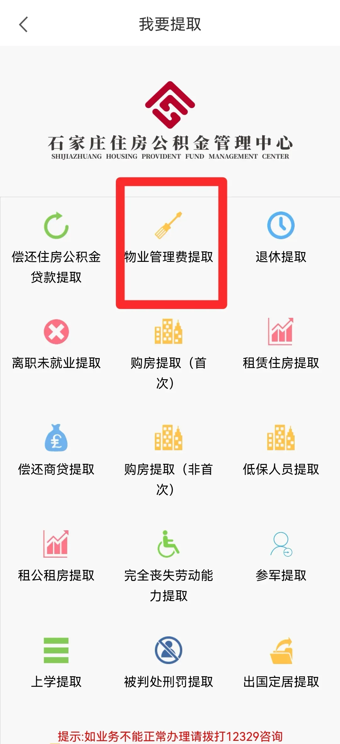 缴存人可携带本人身份证、Ⅰ类银行卡(可支持工行、农行、中行、建行、交行)至就近的公积金管理部办理,也可以通过手机公积金APP的“物业管理费提取”模块办理。