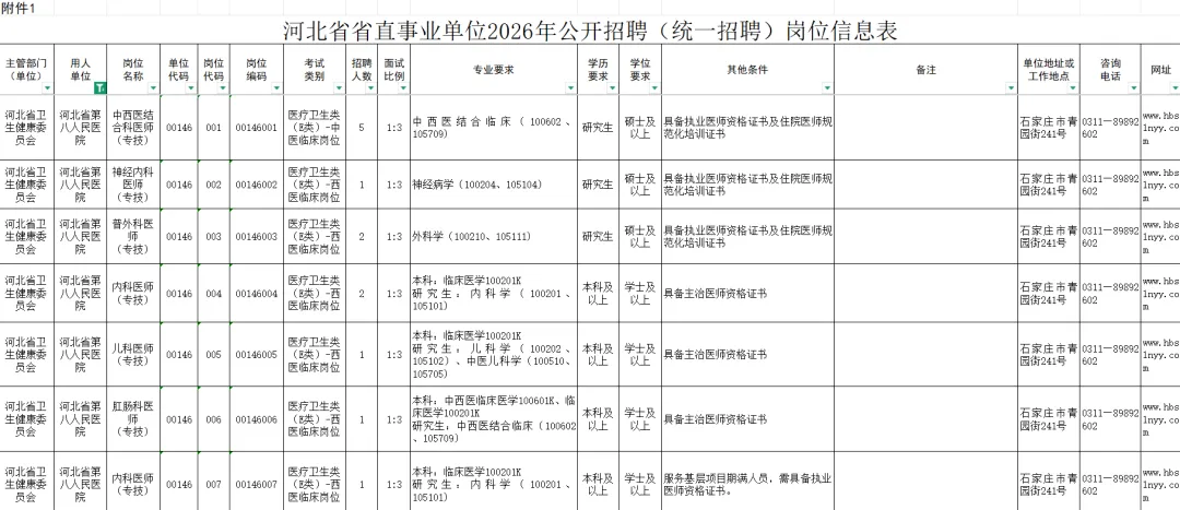 2026年河北省第八人民医院拟公开招聘专业技术岗位人员13名。具体招聘人数和岗位条件详见《河北省省直事业单位2026年公开招聘(统一招聘)工作人员公告》附件1:《河北省省直事业单位2026年公开招聘(统一招聘)岗位信息表》,其中专业参考教育部公布的研究生、本科、高职(高专)专业目录和人力资源和社会保障部公布的技工院校专业目录设置。对于取得海外院校学历学位或毕业于国内院校自设学科的考生,如专业名称与岗位要求专业名称不完全一致,可由用人单位(部门)根据应聘人员在校期间所学课程、研究领域及毕业院校开具的学科专业证明等材料进行综合研判,严格把握,统一标准,作出决定。