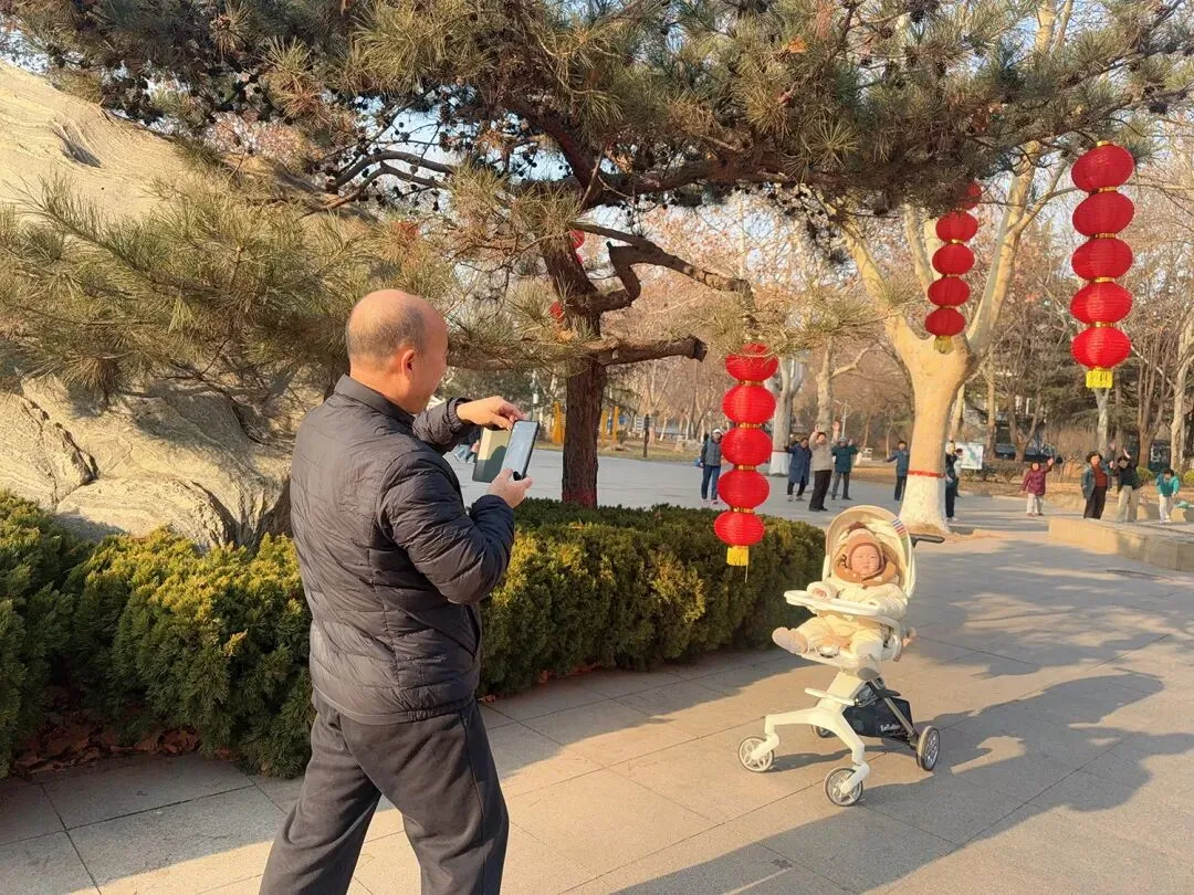 裕西公园内青松挺立,灯笼高挂,市民驻足为孩童拍照留念,在满园年味中记录美好时光。程梦茹 摄