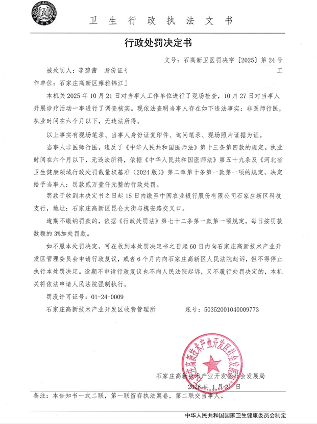 以上事实有现场笔录、当事人身份证复印件、询问笔录、现场照片证据为证。当事人非医师行医,违反了《中华人民共和国医师法》第十三条第四款的规定。执业时间在六个月以下,无违法所得,依据《中华人民共和国医师法》第五十九条及《河北省卫生健康领域行政处罚裁量权基准(2024版)》第二章第十条第一款第一项的规定,决定给予当事人:罚款贰万壹仟元整的行政处罚。
