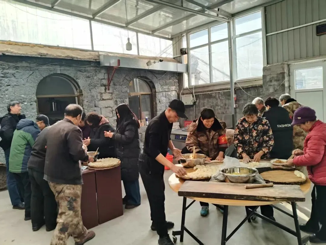 天还没亮,各村党群服务中心、文化礼堂已忙碌起来。和面、调馅、擀皮、包饺……志愿者们分工协作,手上麻利,心里热乎。考虑到老人饮食特点,馅料特意做得少盐软烂;针对失能老人,还专门包了皮薄馅软的“暖心饺”。红灯笼、防滑垫、爱心椅,每个细节都藏着对老人的关照。