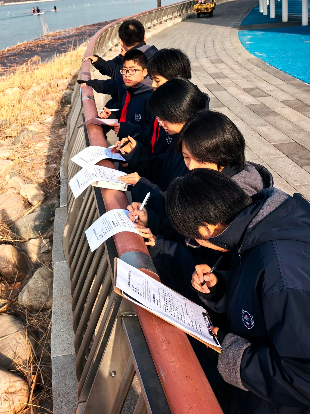 参观完毕后,同学们随即化认知为行动,按照既定分组与路线,有序奔赴太平河沿线各预定区段,展开首次实地调研。河畔处处可见同学们专注而活跃的身影:同学们以小组为单位,或对照表单仔细勘查滨水空间与设施,或围绕观察所得展开即时讨论,或认真记录、拍摄,用多种方式收集着一手资料。整个过程有条不紊,充分展现了同学们在实践中的团队精神与求真态度。