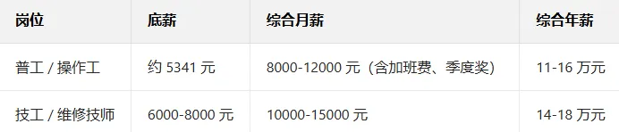 薪酬结构:基本工资 + 绩效奖金 + 加班费 / 倒班津贴,部分岗位有季度 / 年终奖励,整体薪酬对标行业顶尖。